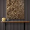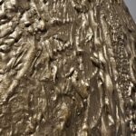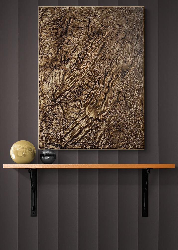 Jedes Stück wird individuell entworfen und mit großer Sorgfalt von Hand gefertigt. Die besondere Oberflächengestaltung entsteht durch präzise Verarbeitung, während die fein abgestimmten, metallischen Farbtöne im Lichteinfall lebendig werden und dem Bild einen besonderen Glanz verleihen.
