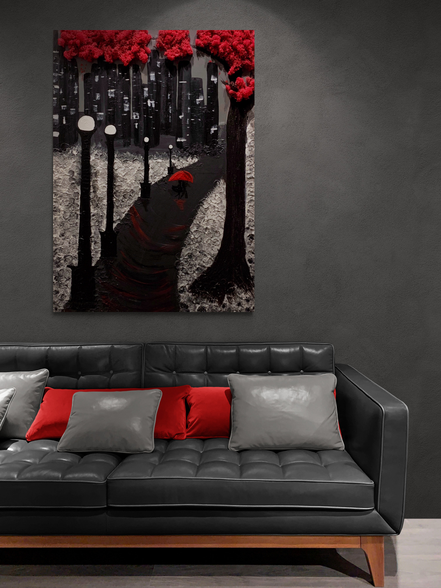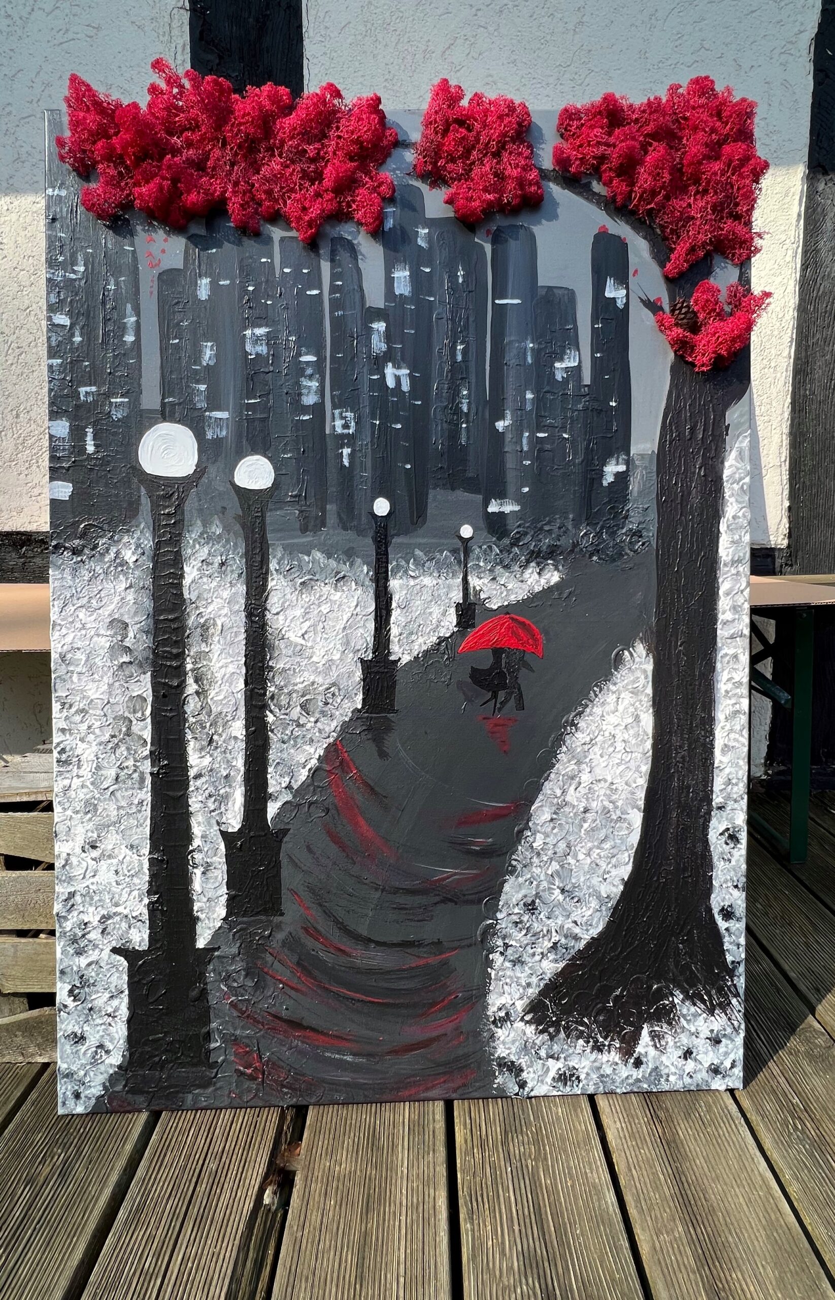 Die Texturen und Farben in diesem Gemälde bringen die Energie und Dynamik von New York zum Leben. Die Kombination aus dem handgemalten Stil und dem Moosdekor macht dieses Kunstwerk zu einem wahrhaft einzigartigen Stück.